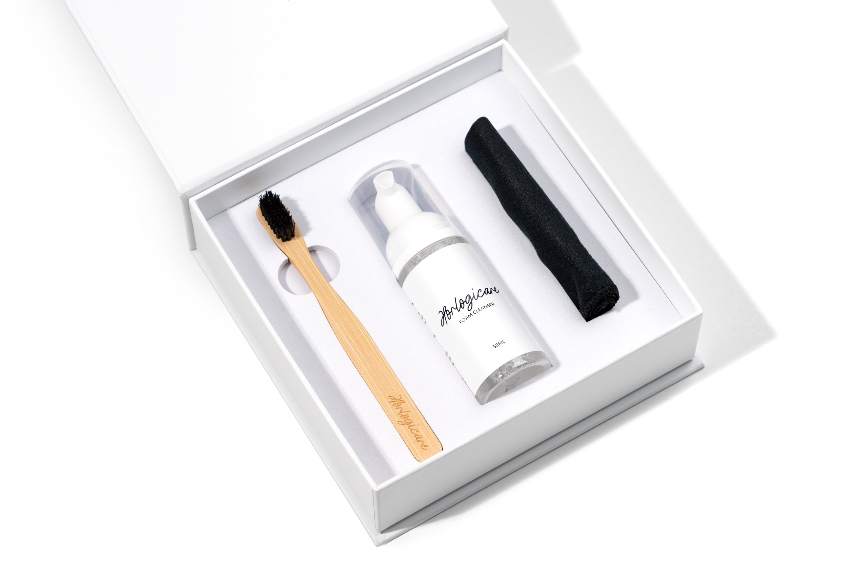 Verwijder uw horloge en zorg ervoor dat de kroon volledig is gesloten. Breng een kleine hoeveelheid reinigingsschuim direct aan op de kast of de band.
